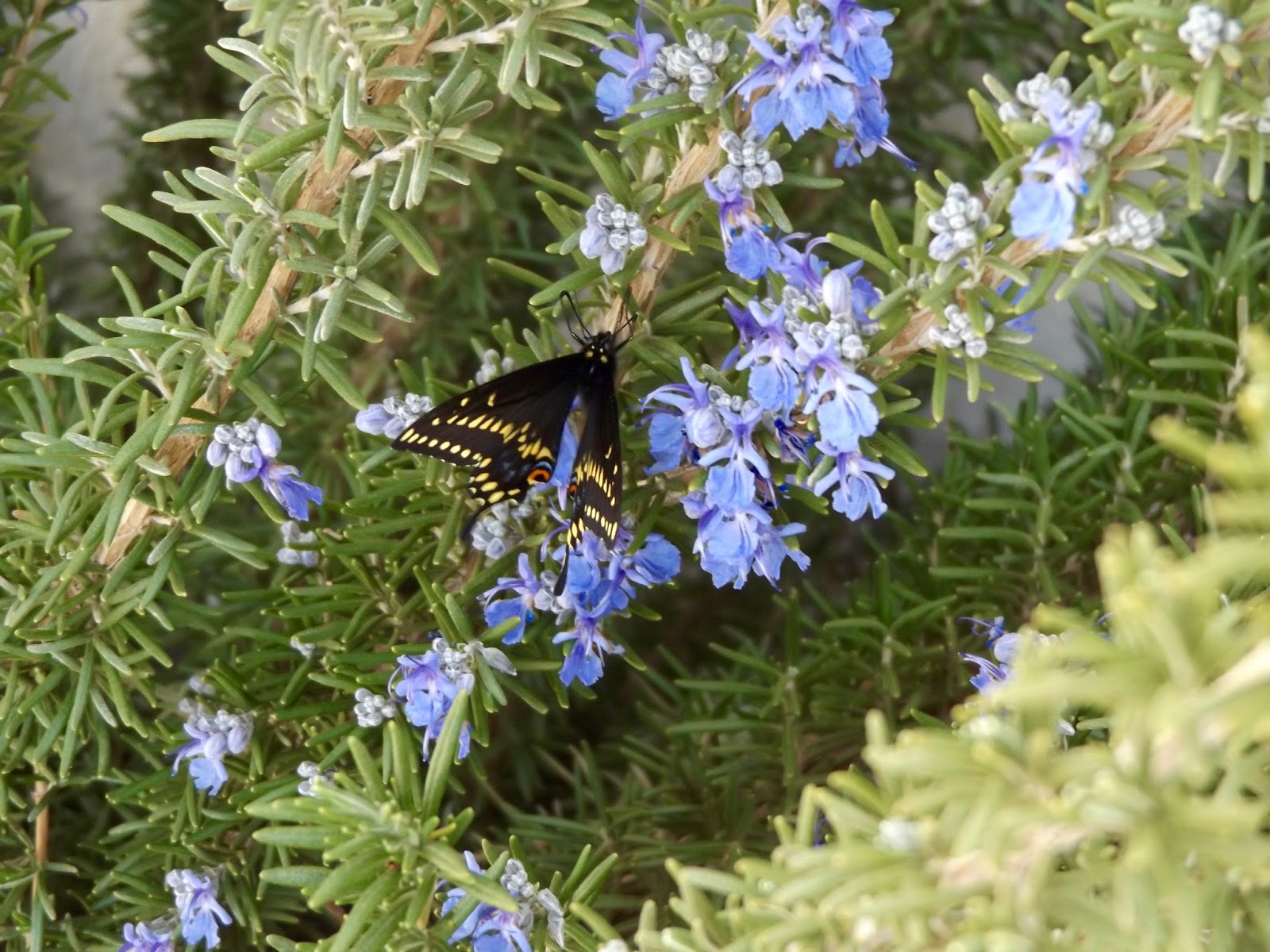 | Bowing to the force of the unrelenting wind, this butterfly remained in its sheltered spot on a rosemary plant. It was there when we arrived at the winery and it was still there when we left. |