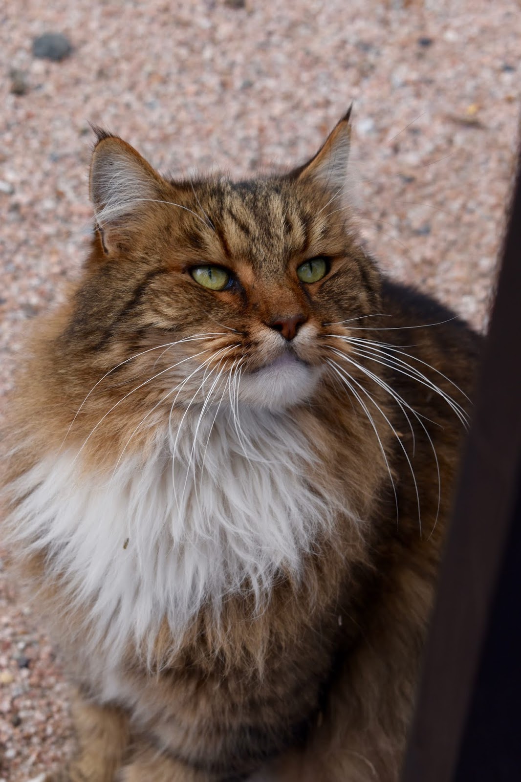 We spotted a feline across a yard and even at a distance could tell it was a Maine coon cat, one of our favorites. When we called, she exhibited all the typical Maine coon characteristics: meowing and rolling on the ground. Eventually, we got her to approach closer and were amazed at how beautiful she was.